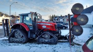En 2016. le CSPBSL a fait l’acquisition d’une machine plus performante pour la coupe des branches aux abords des sentiers en remplacement de la faucheuse en usage jusqu’à ce moment. En décembre, de fortes précipitations d’une neige lourde et collante ont motivé le conseil d’administration à prendre la décision de doter le Club de cet outil de débroussaillage comprenant trois scies circulaires hydrauliques montées sur la gratte avant du tracteur sur chenilles MF7475.